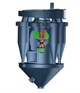 中粗粉和細(xì)粉通過大風(fēng)葉后,在上升氣流的作用下,繼續(xù)上升穿過立式導(dǎo)向葉片進入二級選粉區(qū)。含塵氣流在旋轉(zhuǎn)的籠型轉(zhuǎn)子形成的強烈而穩(wěn)定的平面渦流作用下,使中粗粉在離心力的作用下被拋向立式導(dǎo)向葉片后失去動能,落到中粗粉收集錐中,通過中粗粉管排出。符合要求的細(xì)粉穿過籠型轉(zhuǎn)子進入其內(nèi)部,隨循環(huán)風(fēng)進入低阻型旋風(fēng)分離器中,隨后滑落到細(xì)粉收集錐內(nèi)成為成品。